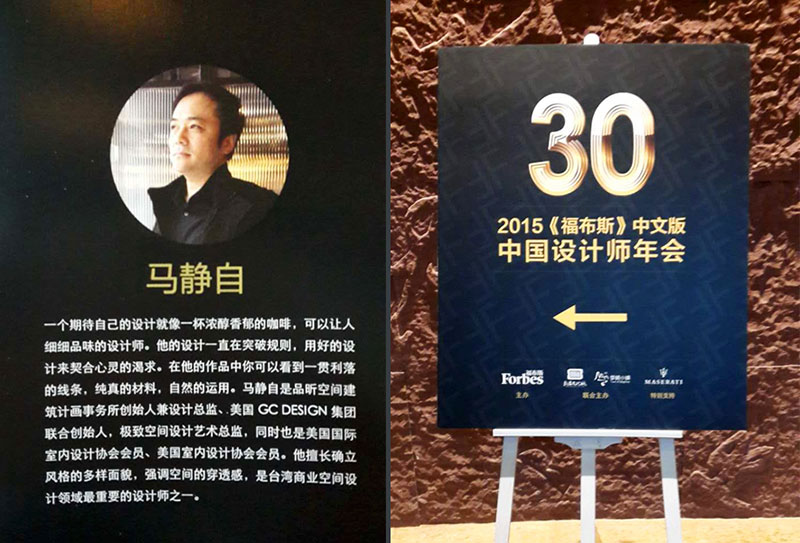 2015《福布斯》中文版·中國設計師年會暨頒獎典禮,於2015年11月25日、26日在杭州余杭良渚君瀾度假酒店隆重舉行。《福布斯》中文版權威的榜單在中國媒體中獨樹一幟,在其所涉及的領域中都成為引起廣泛關注和媒體爭相報導的標竿,國內眾多知名設計師、藝術家以及學院派人士前赴於此共襄盛舉。美國GC Design集團聯合創始人、品昕設計 創始人兼設計總監 馬靜自 以多元的設計風貌與獨特的空間美感,征服國際性設計領域,成為台灣商業設計空間領域中最重要的設計師,更於此榮獲「中國最具發展潛力設計師30強」,成為中國當代設計新秀。