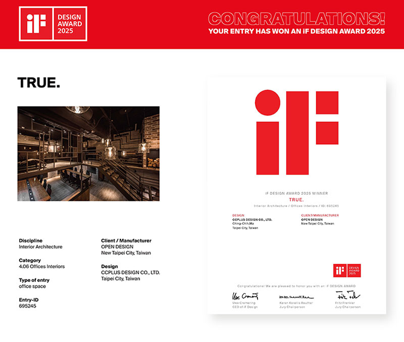 品昕設計 設計總監 馬靜自 運用新舊交融的設計哲學,透過樓梯扶手、挑高壁面與夾層辦公室外的不規則幾何線條,創造豐富趣味的視覺層次,締造純粹懷舊氛圍的辦公場域《TRUE.初 空間》,於本屆賽事中大放異彩,勇奪2025 德國iF設計大獎「Winner」,再度彰顯品牌的卓越創意與國際視野!