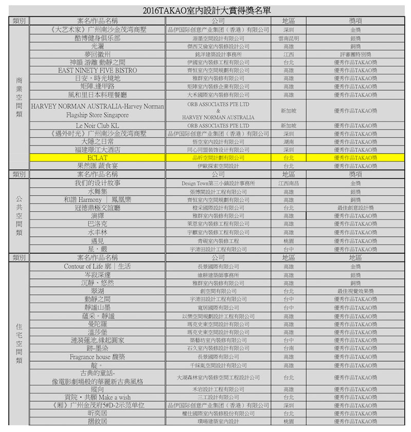TAKAO室內設計大賞為高雄高雄市室內設計裝修商業同業公會精心展出的活動,以凝聚當代設計師的創意思維,推動空間與視覺上的文化品質。在眾多菁英的競爭下,品昕設計 馬靜自設計總監從中脫穎而出,以ECLAT系列作品,打破跨產業間的隔閡,連結紡織業的柔美意象,榮獲優秀作品TAKAO獎。