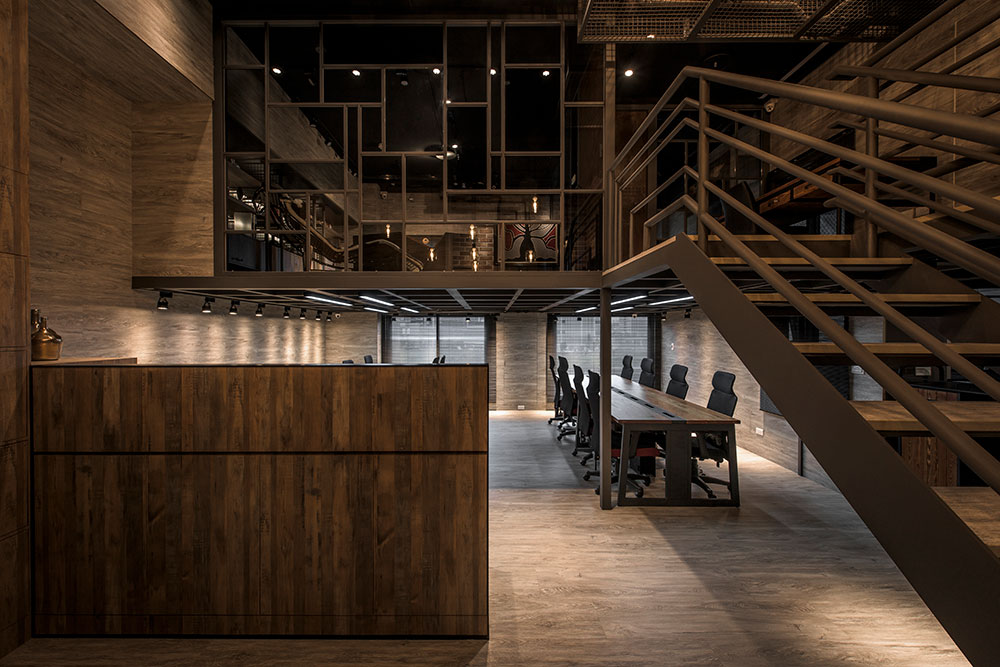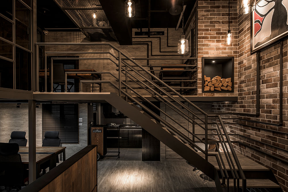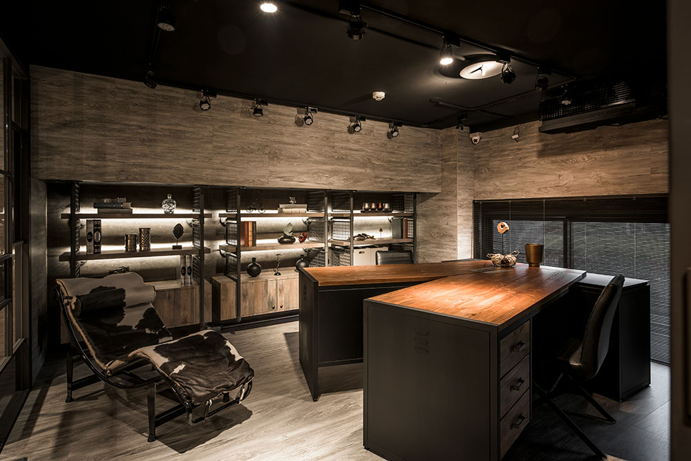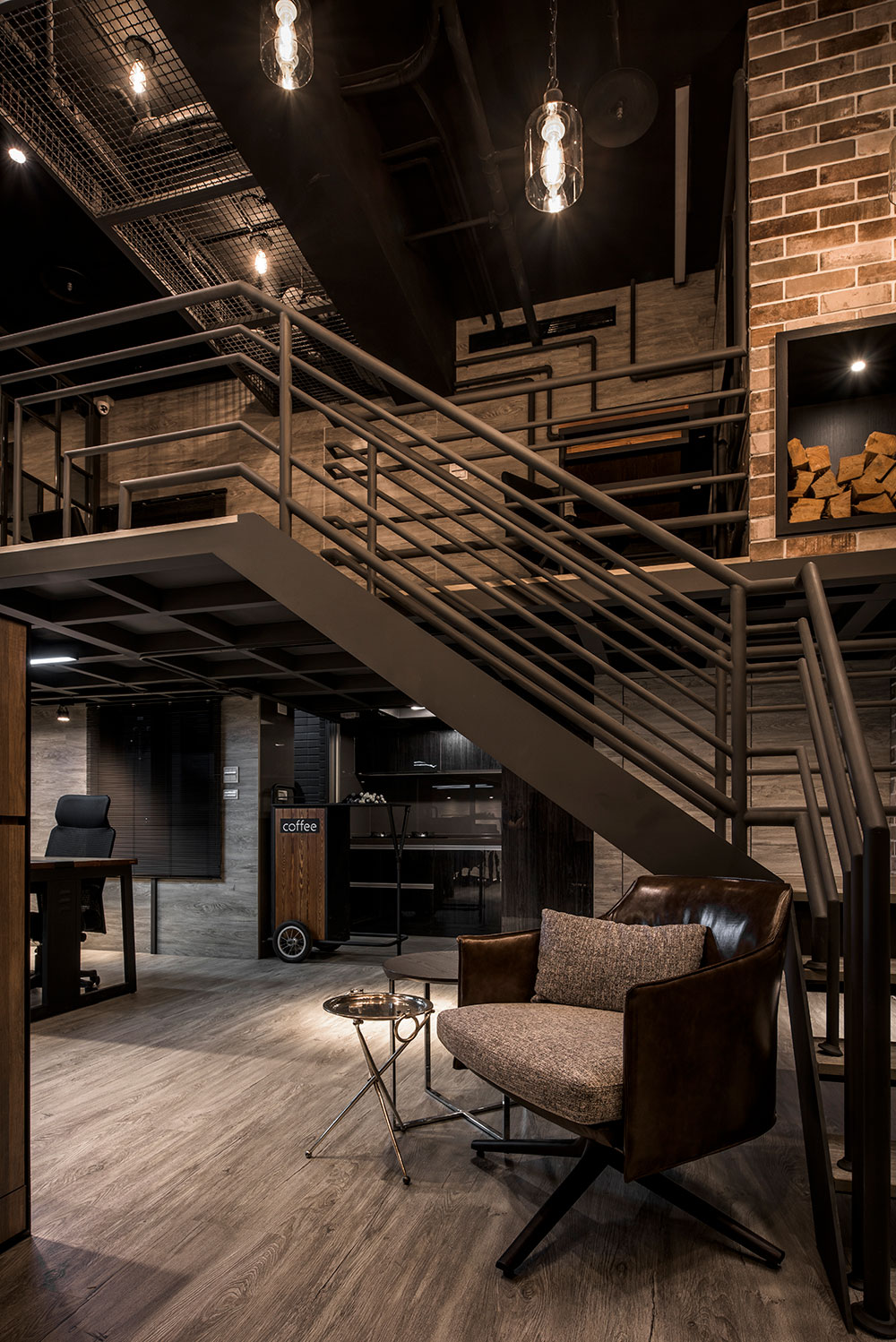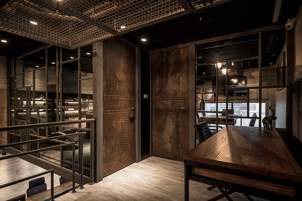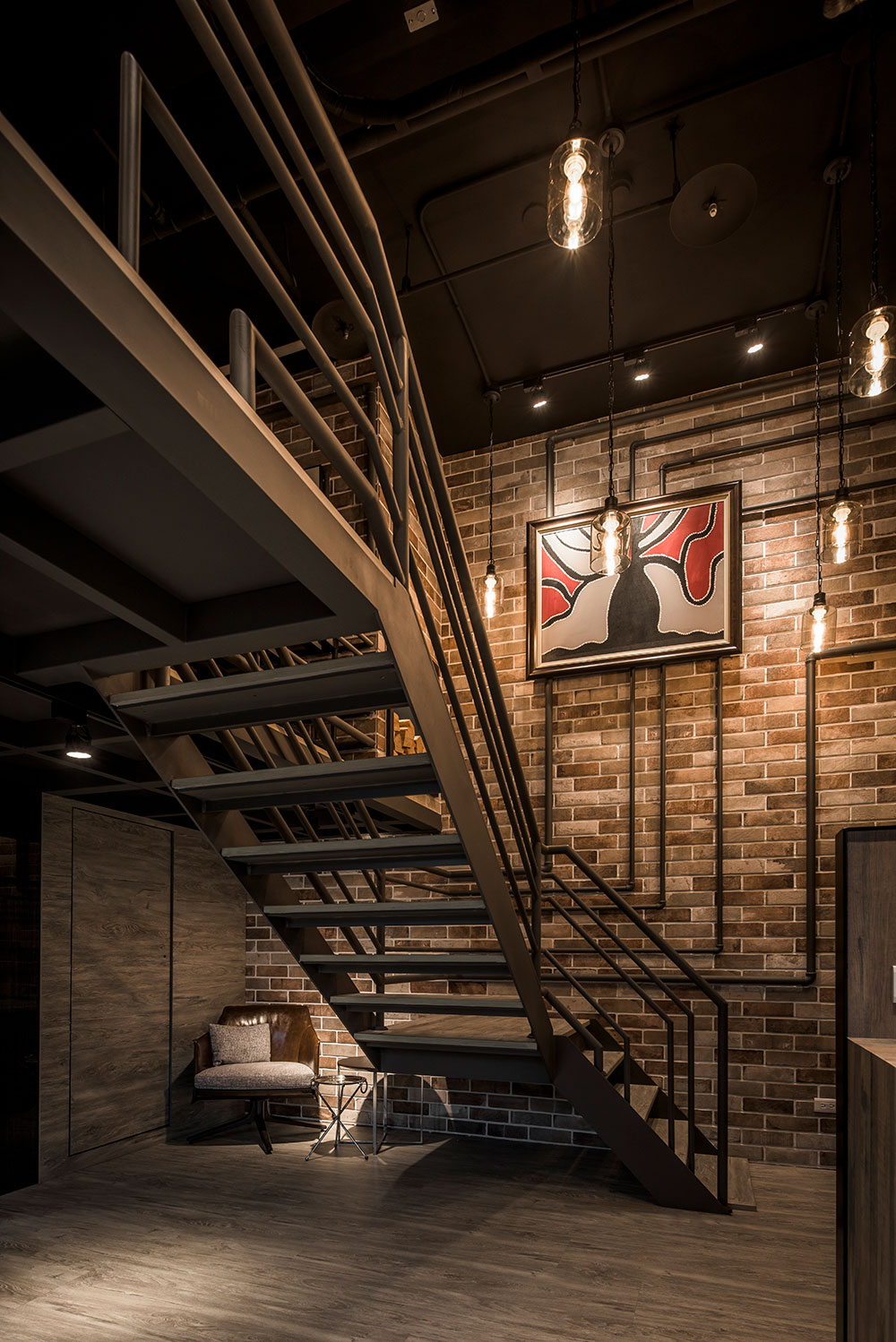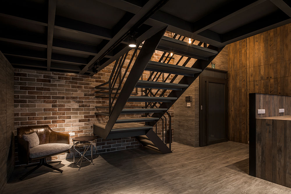 門片以鐵門仿製鏽鐵的斑駁感再以鉚釘裝飾,傢俱部分以原木色為基底,結合黑色、咖啡色、白色…等色,結合工藝手法使傢俱襯托出空間的強烈質感;部分以材質處理呈現復古的斑駁質感;部分延伸樓梯扶手的管線重新組構等展現LOFT風格的粗獷感。挑高部分以不規則分割的造型金屬框、交錯分布的清玻、黑玻、管線延伸的設計手法延伸視覺高度及空間寬闊感。藉由自然光線、柔黃色調的燈光解決一致性色調帶來的冰冷感,並將燈具在不同區域依空間屬性有所不同,挑高空間以垂吊型式的裸露燈泡外罩玻璃罩並藉由玻璃隔間的反射特性呈現公共區域的大器與沉穩質感,將空間質感細細體現。