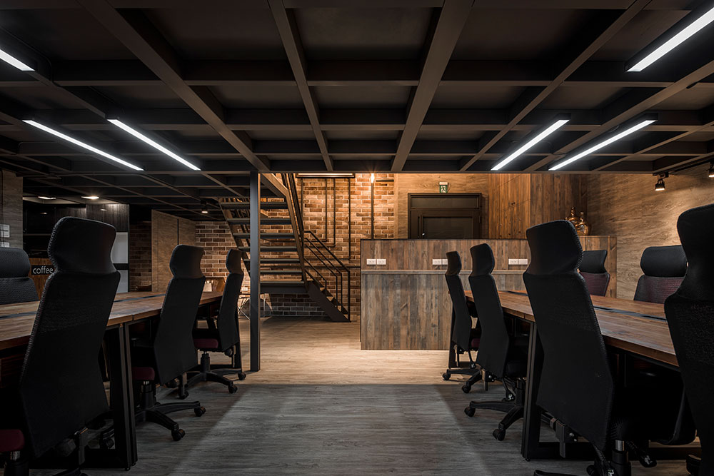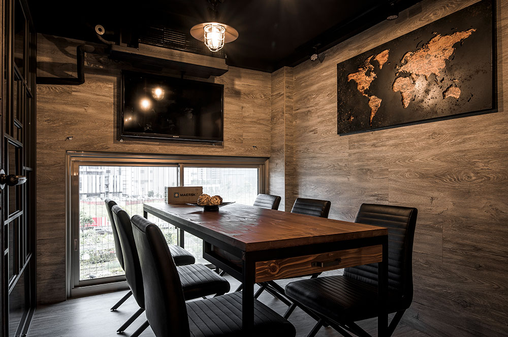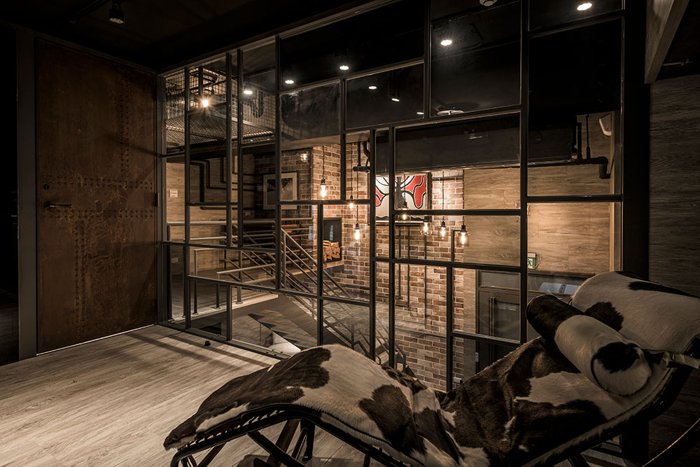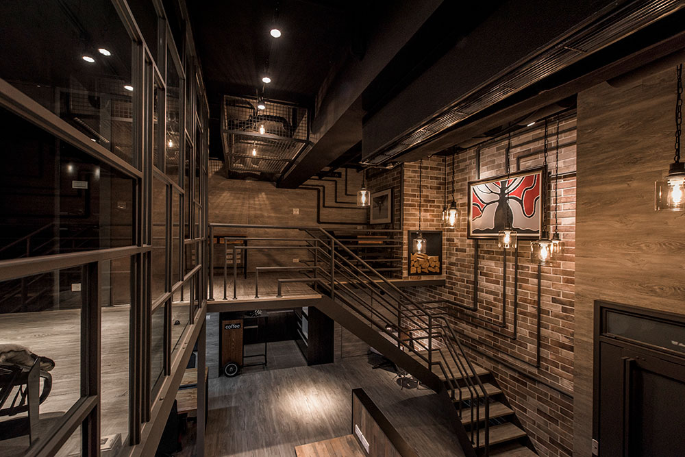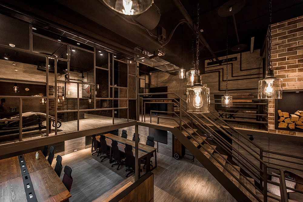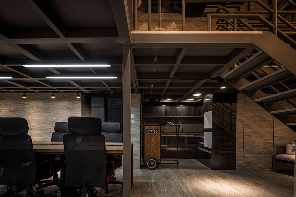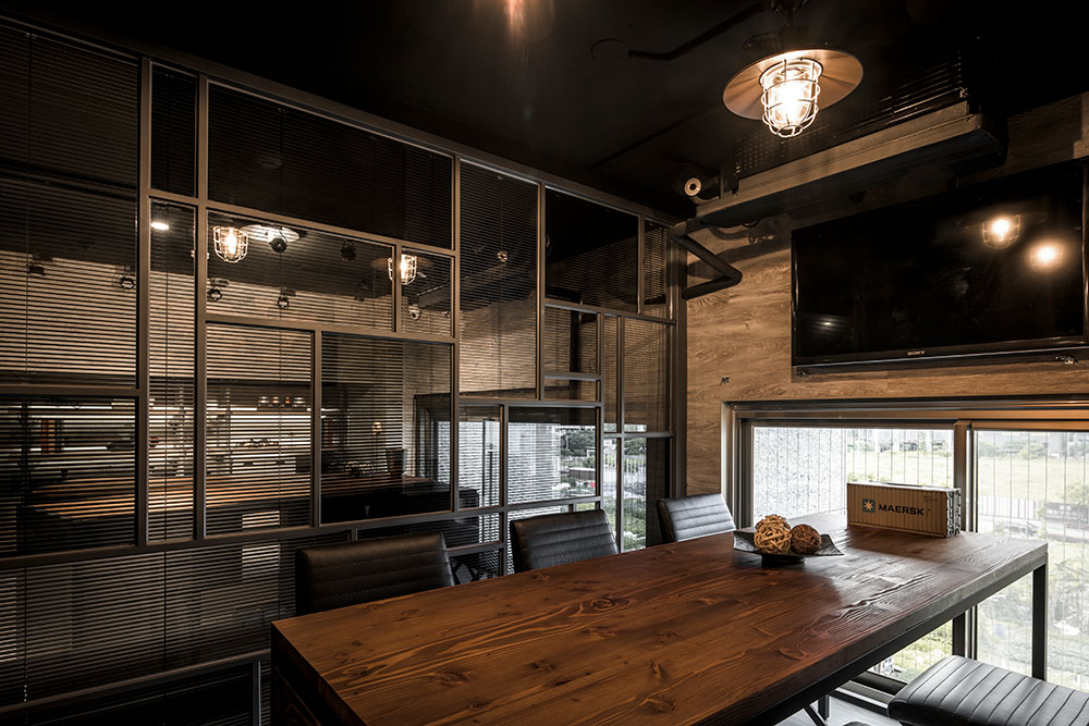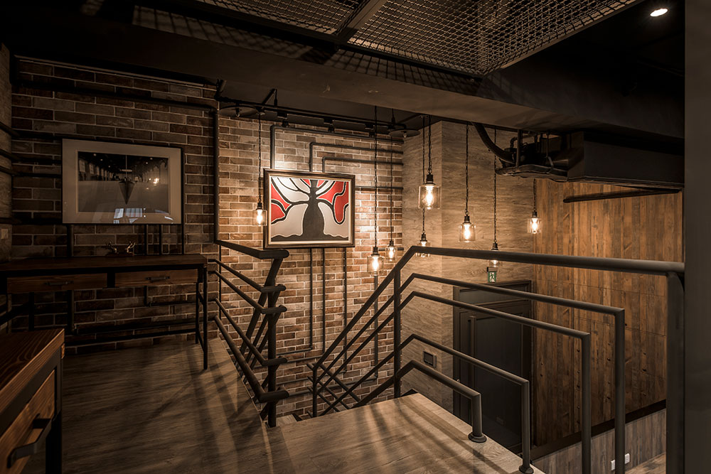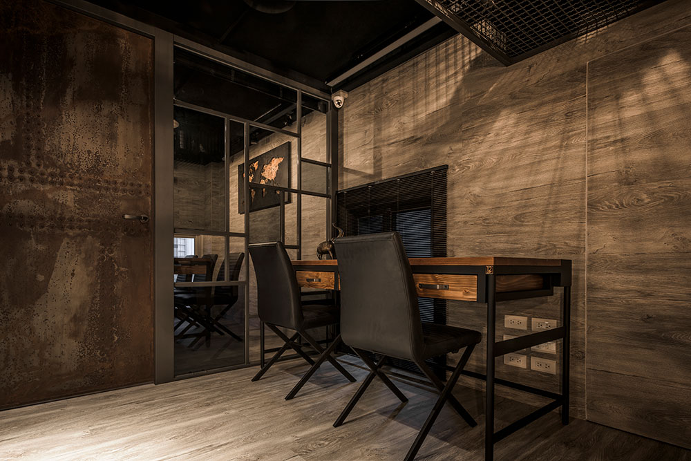 門片以鐵門仿製鏽鐵的斑駁感再以鉚釘裝飾,傢俱部分以原木色為基底,結合黑色、咖啡色、白色…等色,結合工藝手法使傢俱襯托出空間的強烈質感;部分以材質處理呈現復古的斑駁質感;部分延伸樓梯扶手的管線重新組構等展現LOFT風格的粗獷感。挑高部分以不規則分割的造型金屬框、交錯分布的清玻、黑玻、管線延伸的設計手法延伸視覺高度及空間寬闊感。藉由自然光線、柔黃色調的燈光解決一致性色調帶來的冰冷感,並將燈具在不同區域依空間屬性有所不同,挑高空間以垂吊型式的裸露燈泡外罩玻璃罩並藉由玻璃隔間的反射特性呈現公共區域的大器與沉穩質感,將空間質感細細體現。