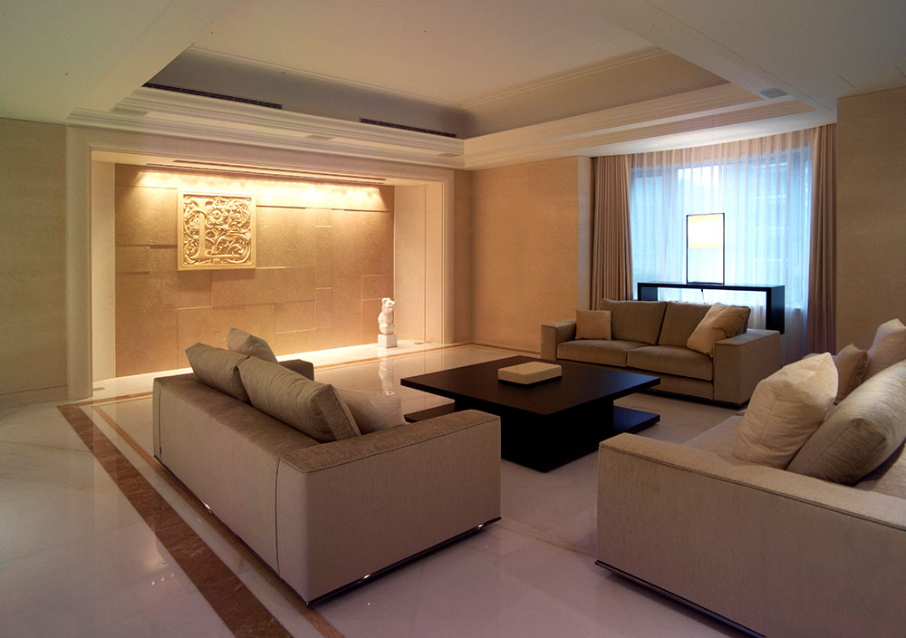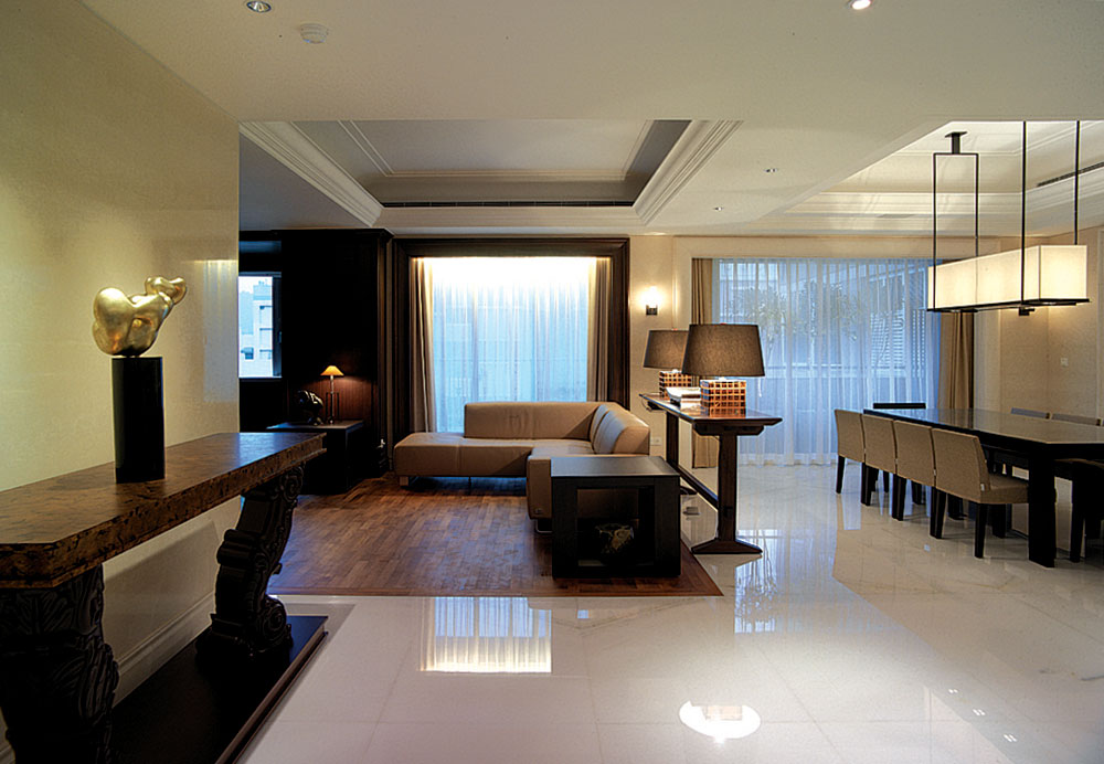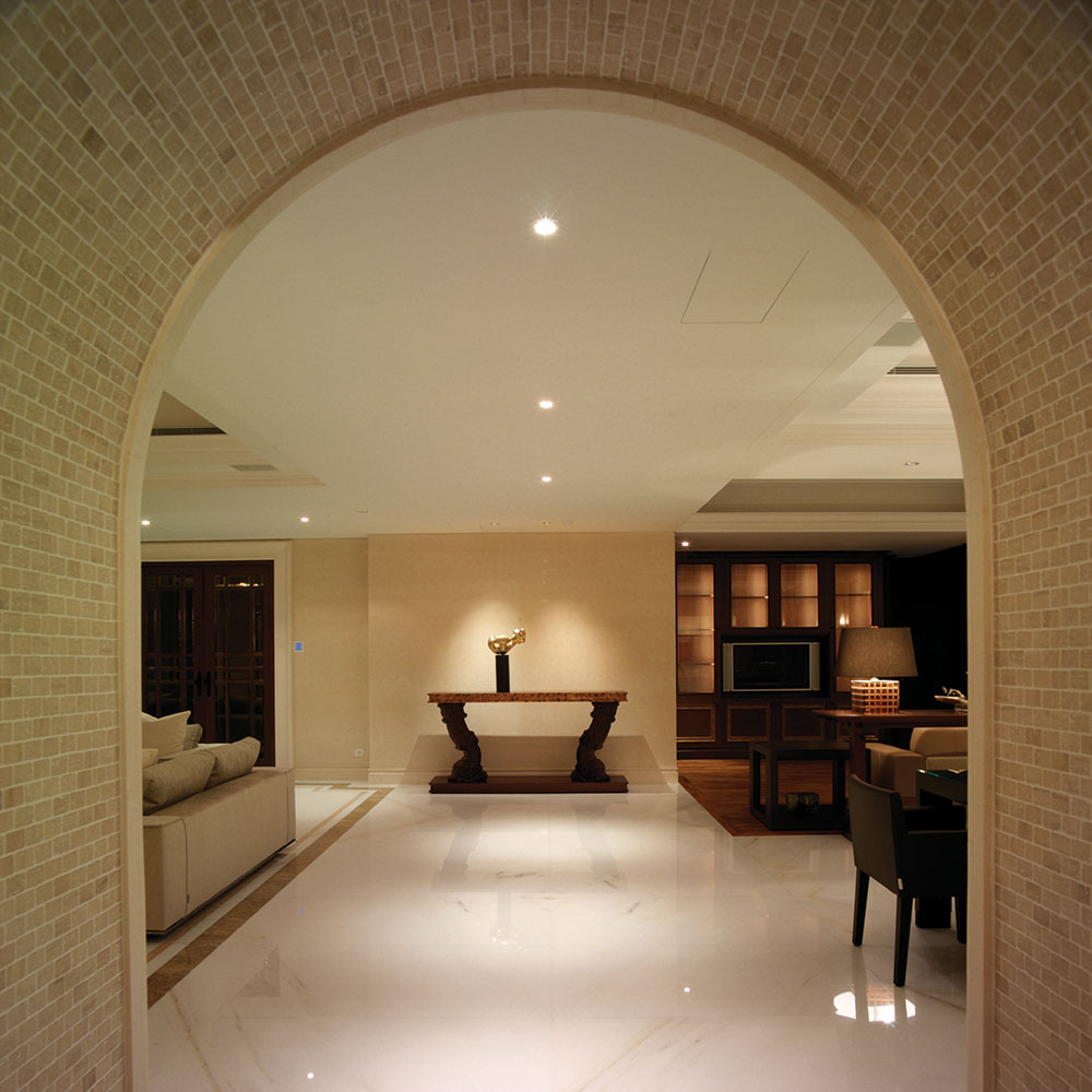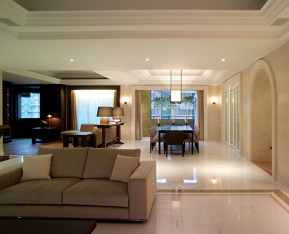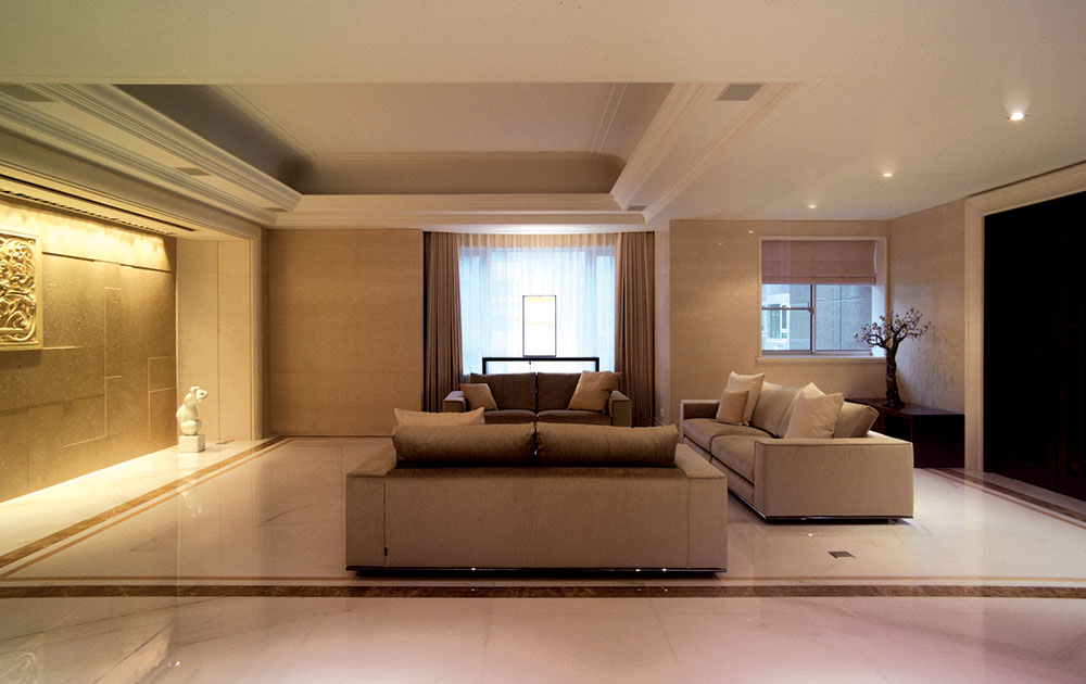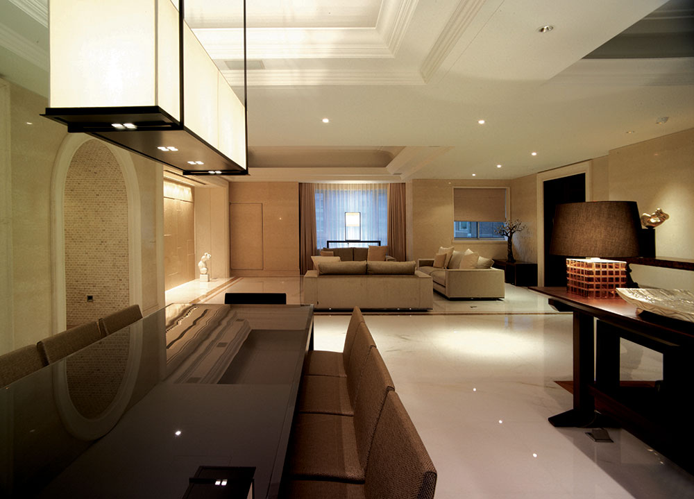 此設計案著重於人文雅涵的心靈靜閱,在整體視覺上,設計師除去厚重裝飾所帶來的繁複及壓迫,保留低調奢華的韻味,透過精細工法及建材質感的完美結合,轉化空間簡單又豐盈的意象形式,使優雅氣息得以在家中曼妙起舞。大理石材置身於空間水平地面及垂直牆面,共同刻鑿低調而華麗的視覺饗宴。玄關之圓弧形拱門,則運用切割線條的大理石材,搭配教堂式十字吊燈,在量體與明確的線面脈絡間,尋生空間開揚優雅的表情;整體空間配置以客廳作為主軸,利用線板、材質、線條與色蘊來砌築空間主體層次的變化與調性,並以深色石材勾勒出空間動線,在一脈清淺綽約的基調中對應出優雅質性,在大空間則講究對稱性,並以材質營造豐富的空間次序,融合家具及傢飾陳列擺放的規劃,將高雅及品味盡數揉合其中,於細節裡釋放現代與新古典間的空間語彙。