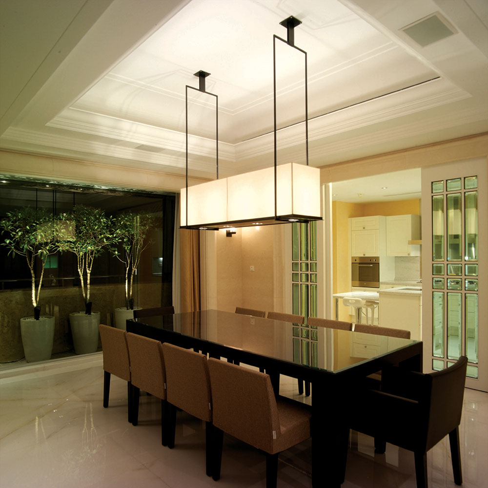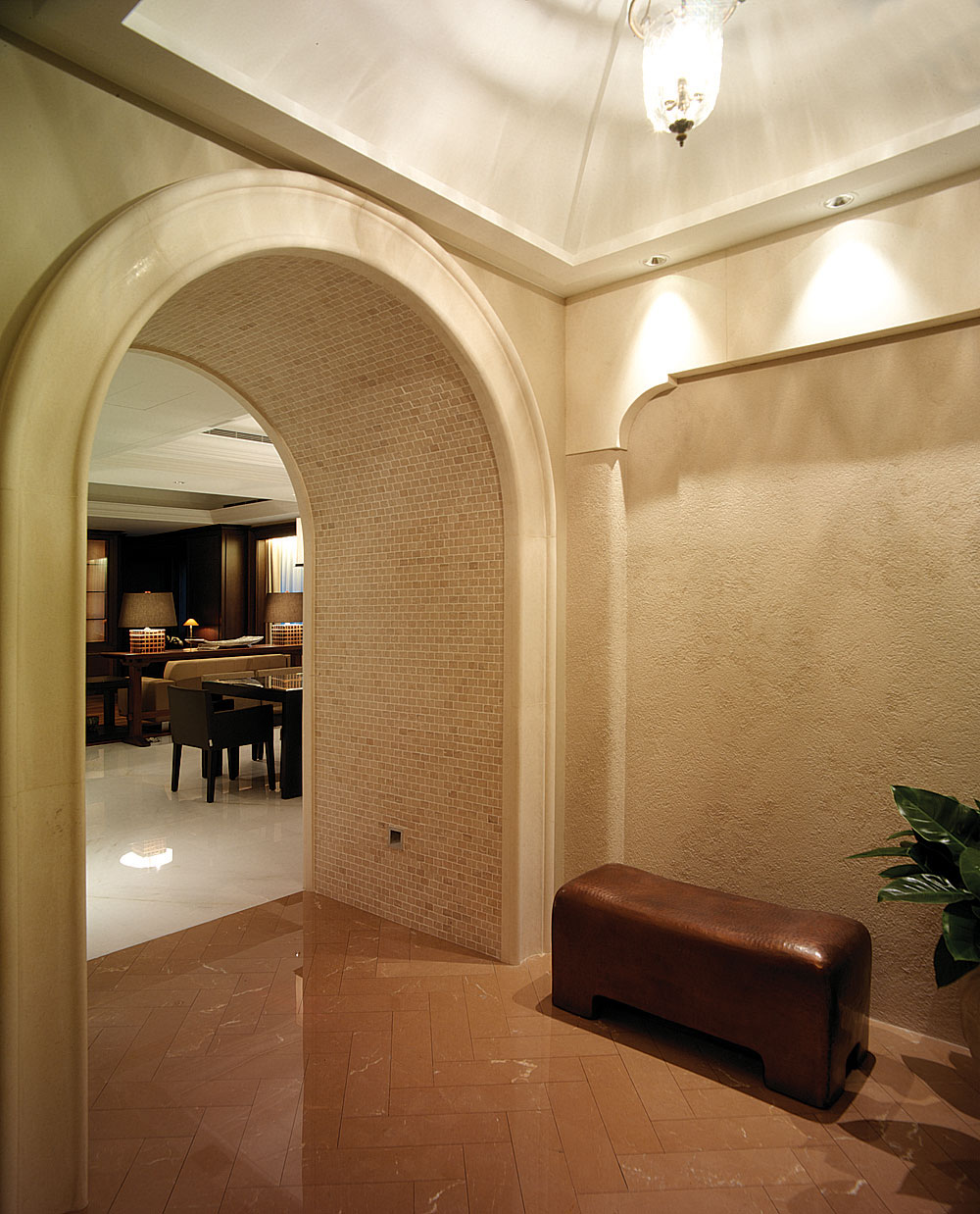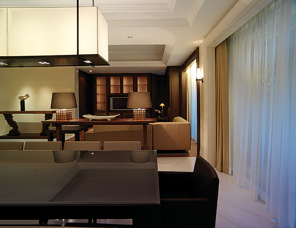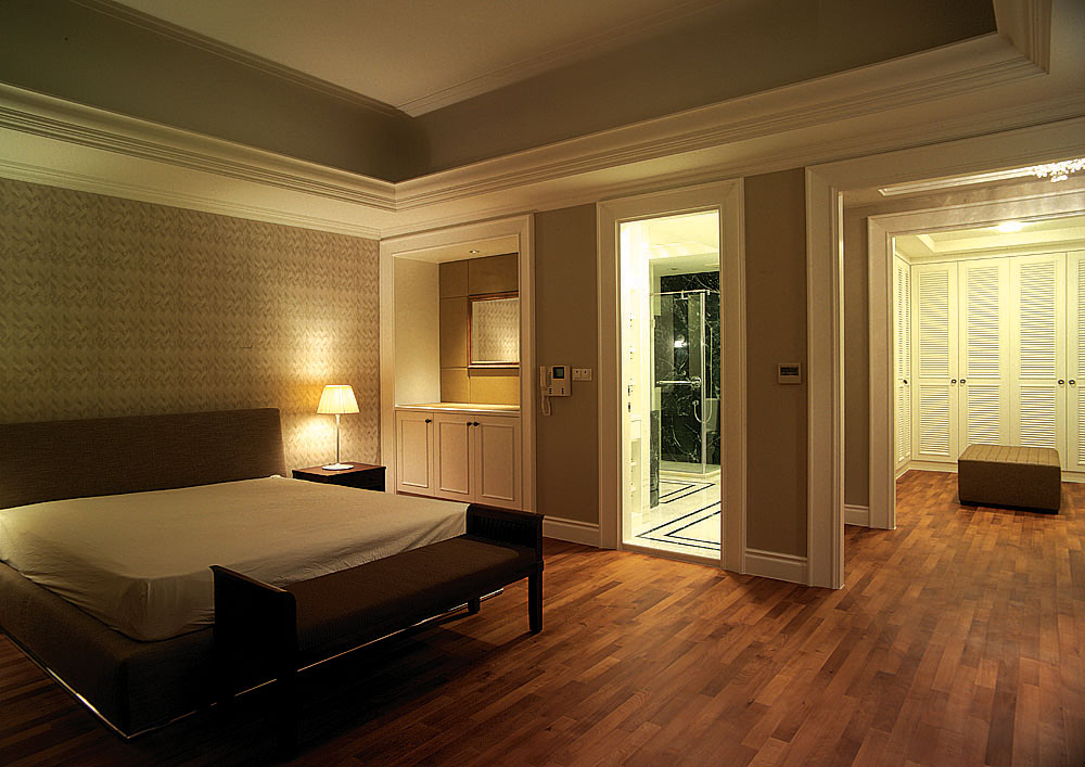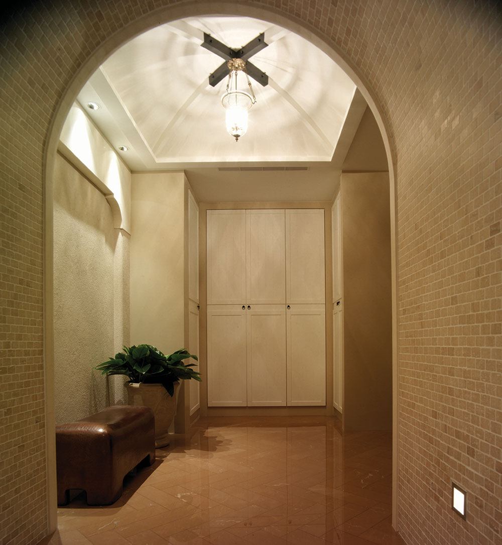 此設計案著重於人文雅涵的心靈靜閱,在整體視覺上,設計師除去厚重裝飾所帶來的繁複及壓迫,保留低調奢華的韻味,透過精細工法及建材質感的完美結合,轉化空間簡單又豐盈的意象形式,使優雅氣息得以在家中曼妙起舞。大理石材置身於空間水平地面及垂直牆面,共同刻鑿低調而華麗的視覺饗宴。玄關之圓弧形拱門,則運用切割線條的大理石材,搭配教堂式十字吊燈,在量體與明確的線面脈絡間,尋生空間開揚優雅的表情;整體空間配置以客廳作為主軸,利用線板、材質、線條與色蘊來砌築空間主體層次的變化與調性,並以深色石材勾勒出空間動線,在一脈清淺綽約的基調中對應出優雅質性,在大空間則講究對稱性,並以材質營造豐富的空間次序,融合家具及傢飾陳列擺放的規劃,將高雅及品味盡數揉合其中,於細節裡釋放現代與新古典間的空間語彙。