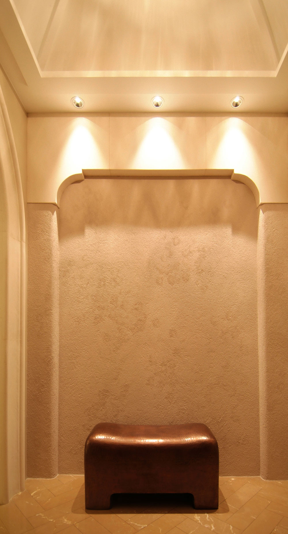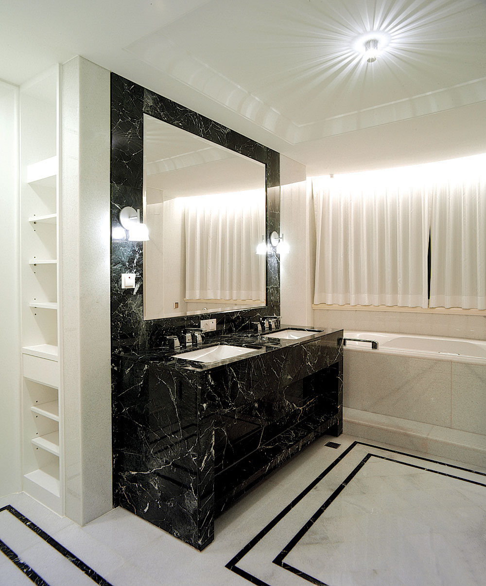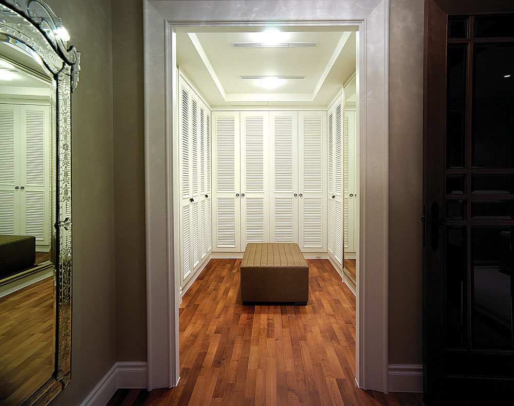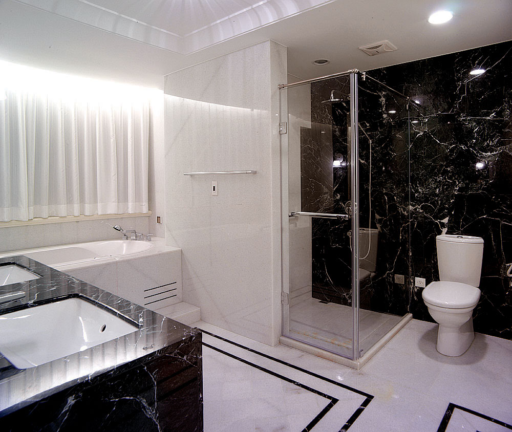 此設計案著重於人文雅涵的心靈靜閱,在整體視覺上,設計師除去厚重裝飾所帶來的繁複及壓迫,保留低調奢華的韻味,透過精細工法及建材質感的完美結合,轉化空間簡單又豐盈的意象形式,使優雅氣息得以在家中曼妙起舞。大理石材置身於空間水平地面及垂直牆面,共同刻鑿低調而華麗的視覺饗宴。玄關之圓弧形拱門,則運用切割線條的大理石材,搭配教堂式十字吊燈,在量體與明確的線面脈絡間,尋生空間開揚優雅的表情;整體空間配置以客廳作為主軸,利用線板、材質、線條與色蘊來砌築空間主體層次的變化與調性,並以深色石材勾勒出空間動線,在一脈清淺綽約的基調中對應出優雅質性,在大空間則講究對稱性,並以材質營造豐富的空間次序,融合家具及傢飾陳列擺放的規劃,將高雅及品味盡數揉合其中,於細節裡釋放現代與新古典間的空間語彙。