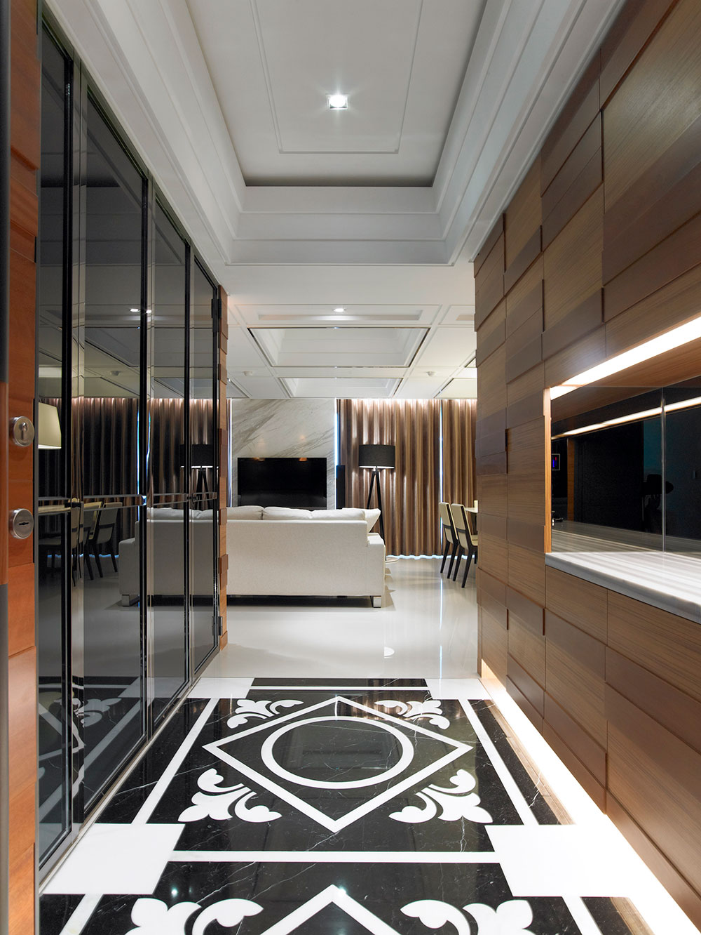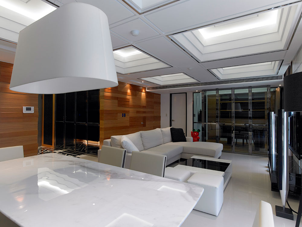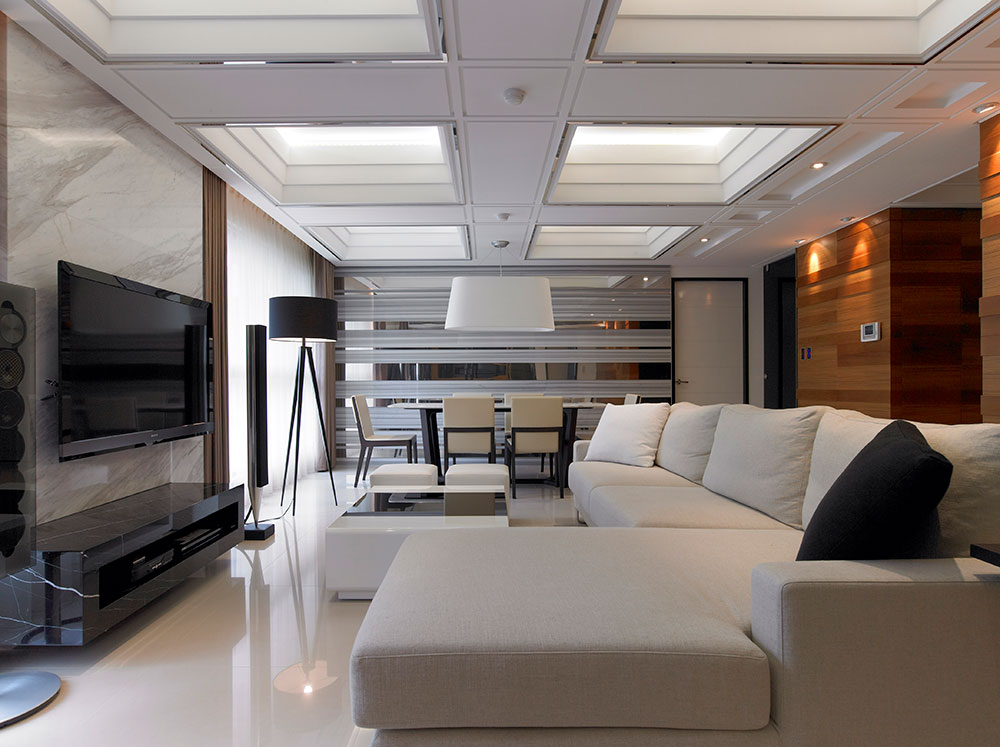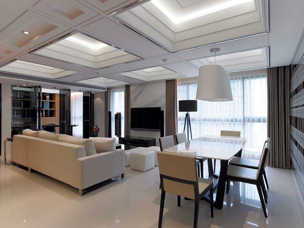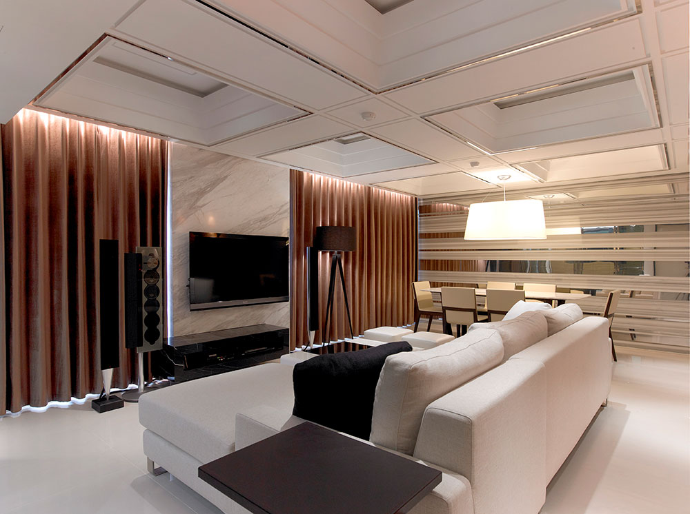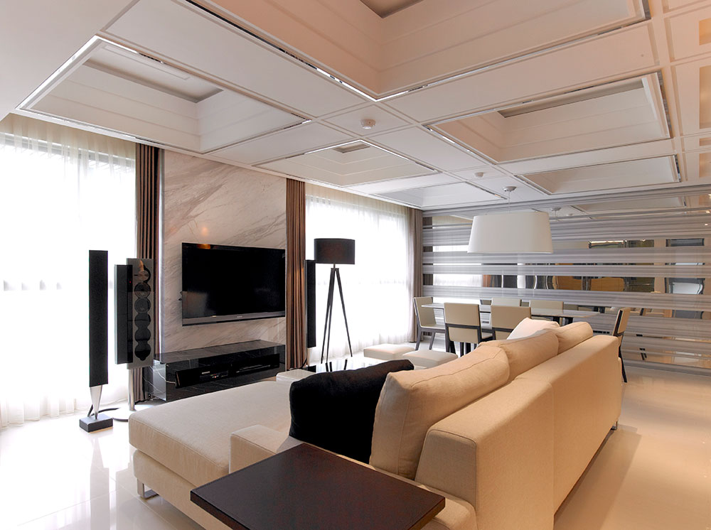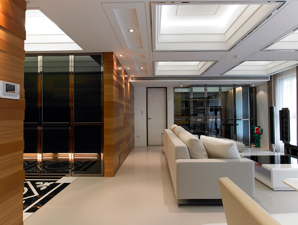 而材質則藉由鏡射、穿透、延伸、樸直的特質,對應空間開放、通透的介質表現,以細膩的工法、比例原則,歸納出光影、高度、機能延續的層次,為家居動線提供緩衝過渡的視覺焦點,穩定空間氛圍的營造及發展。