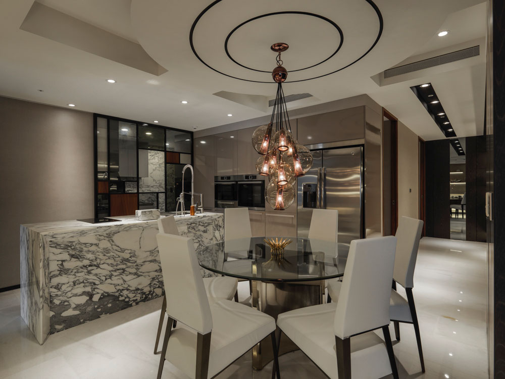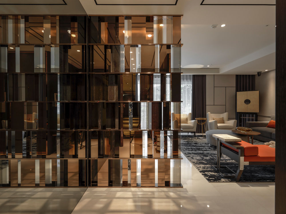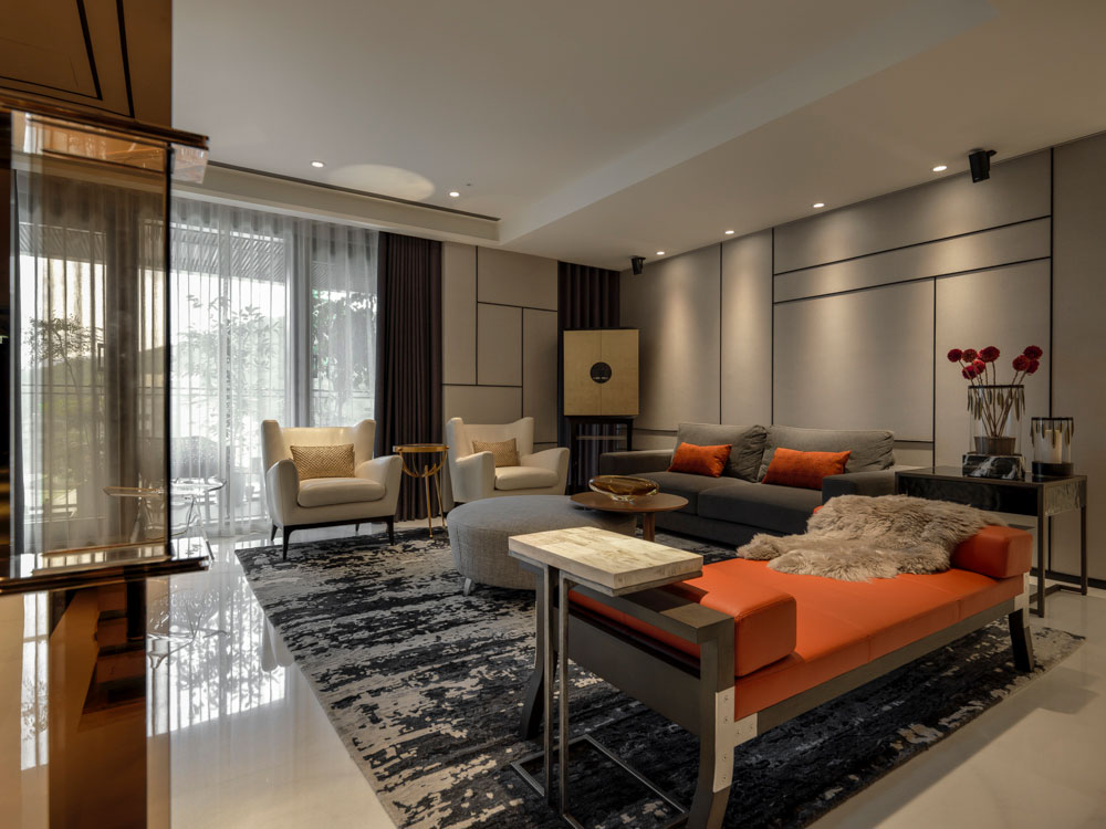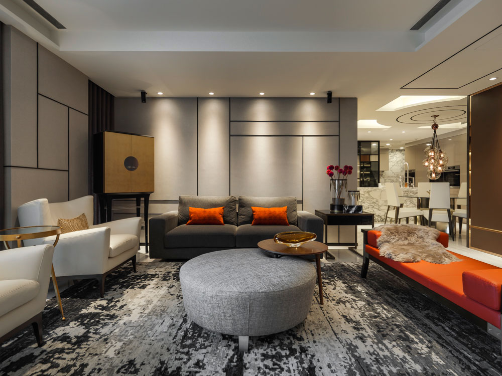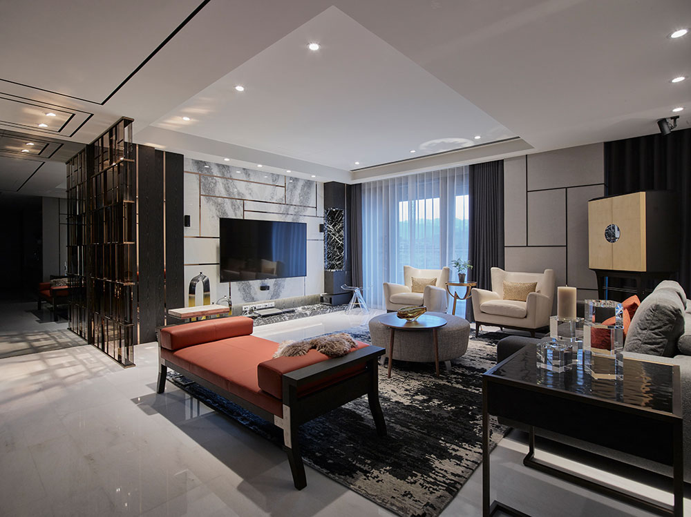 廳內的傢俱配置也依循對比的主題靈活佈局,串連前後的一致性,開闊的視野與合諧的色彩比例,延伸了空間深度,並展現純粹而深邃的優雅風貌。