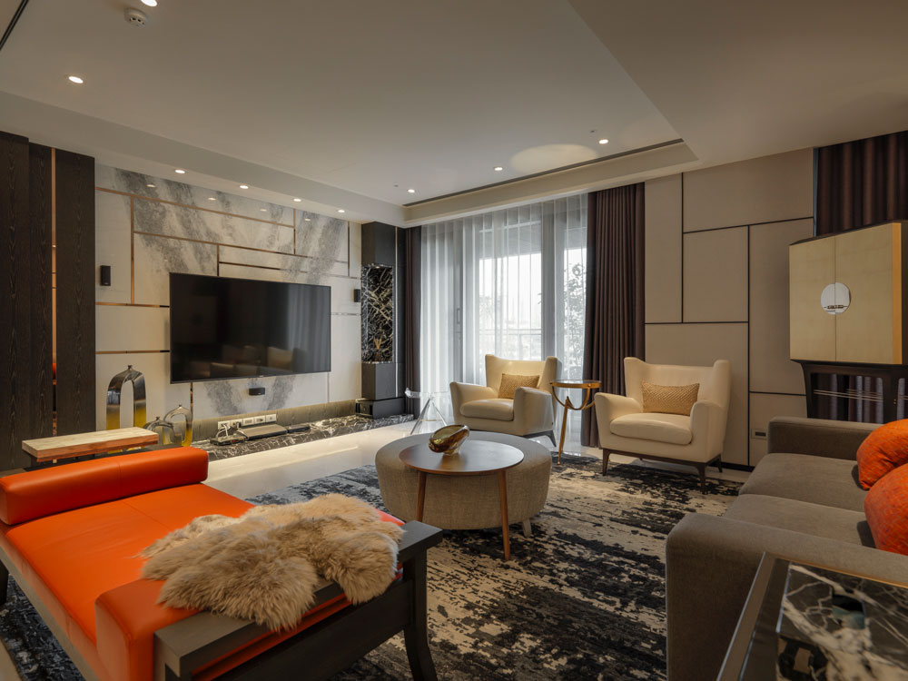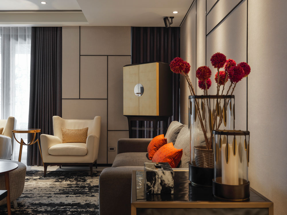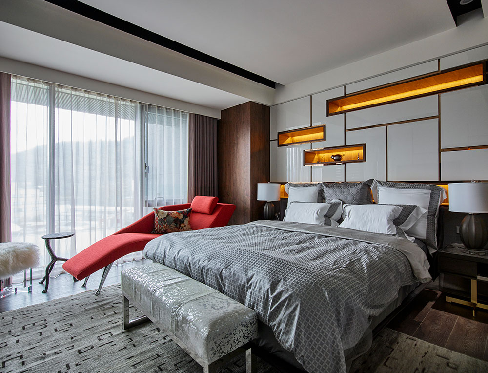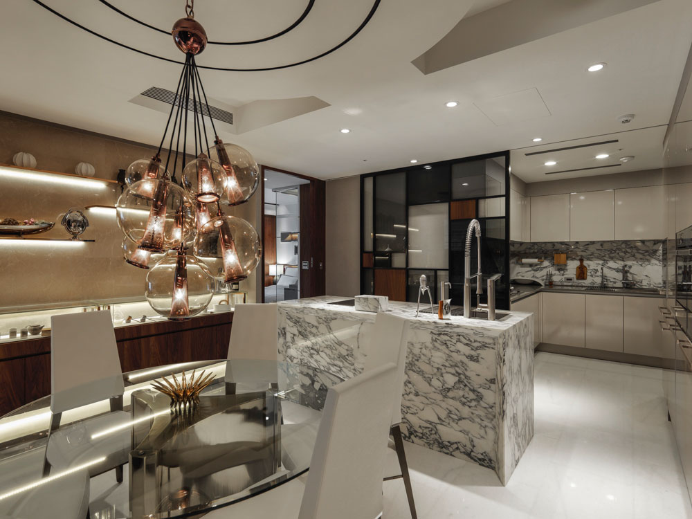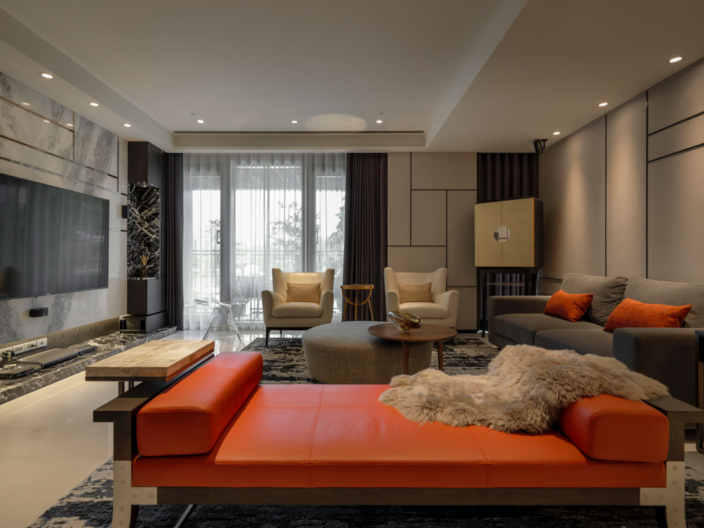 廳內的傢俱配置也依循對比的主題靈活佈局,串連前後的一致性,開闊的視野與合諧的色彩比例,延伸了空間深度,並展現純粹而深邃的優雅風貌。