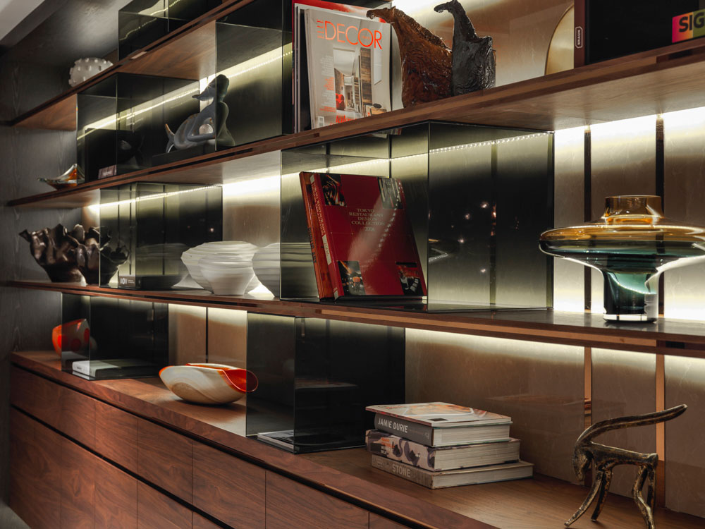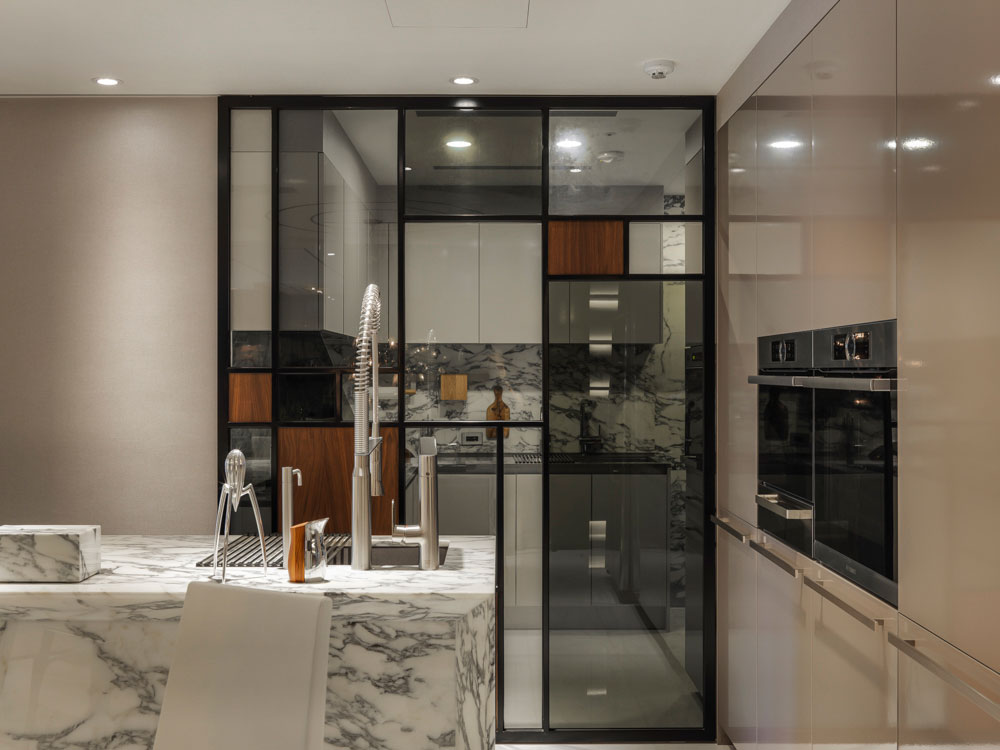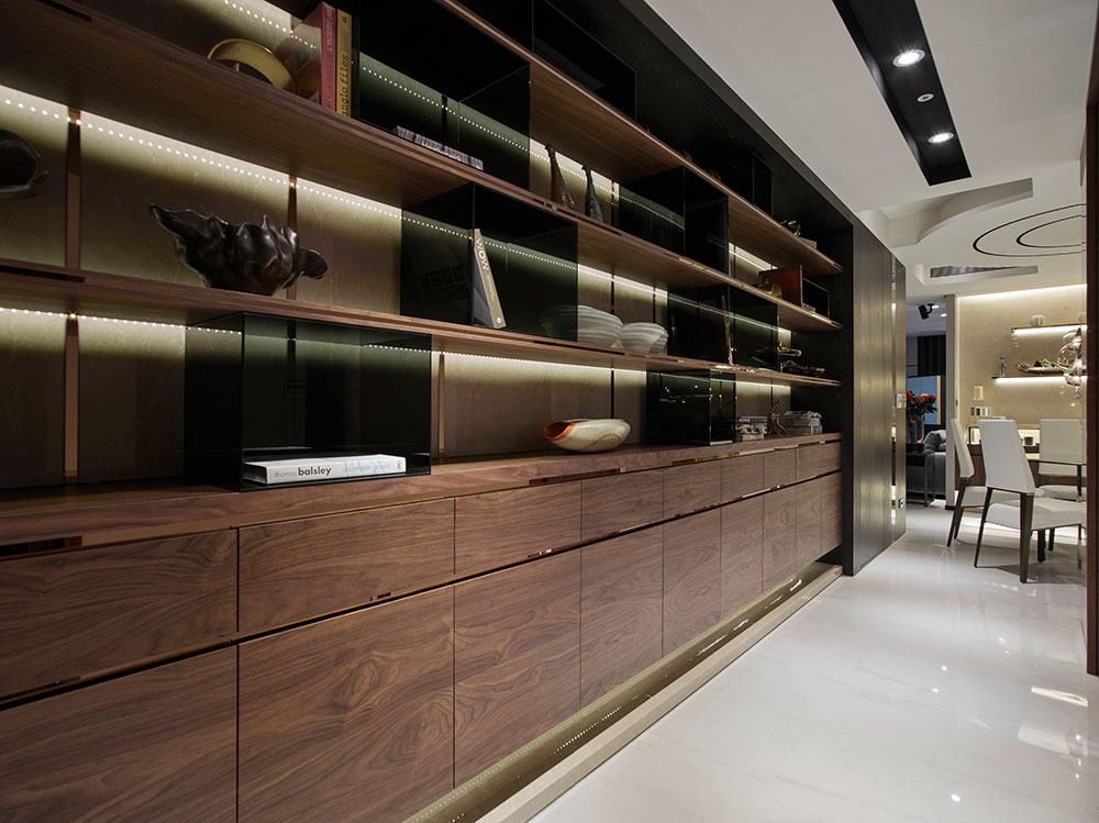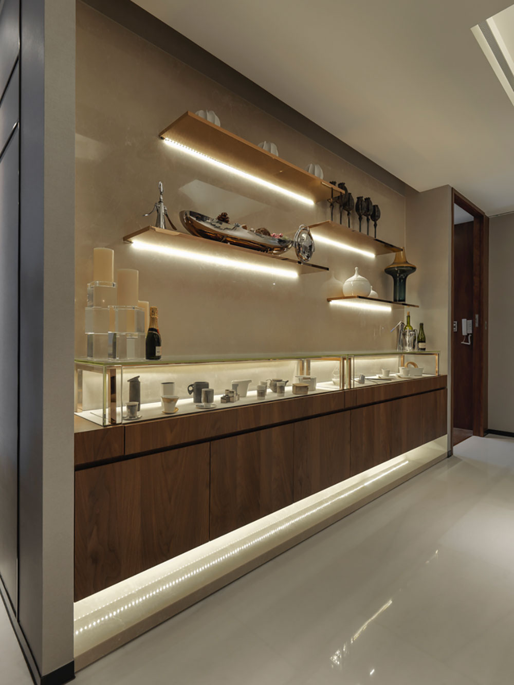 餐廳壁面用以精品專櫃的細膩手法呈現展示品,將高雅及品味盡數揉合其中,於細節裡釋放現代與新的空間語彙。