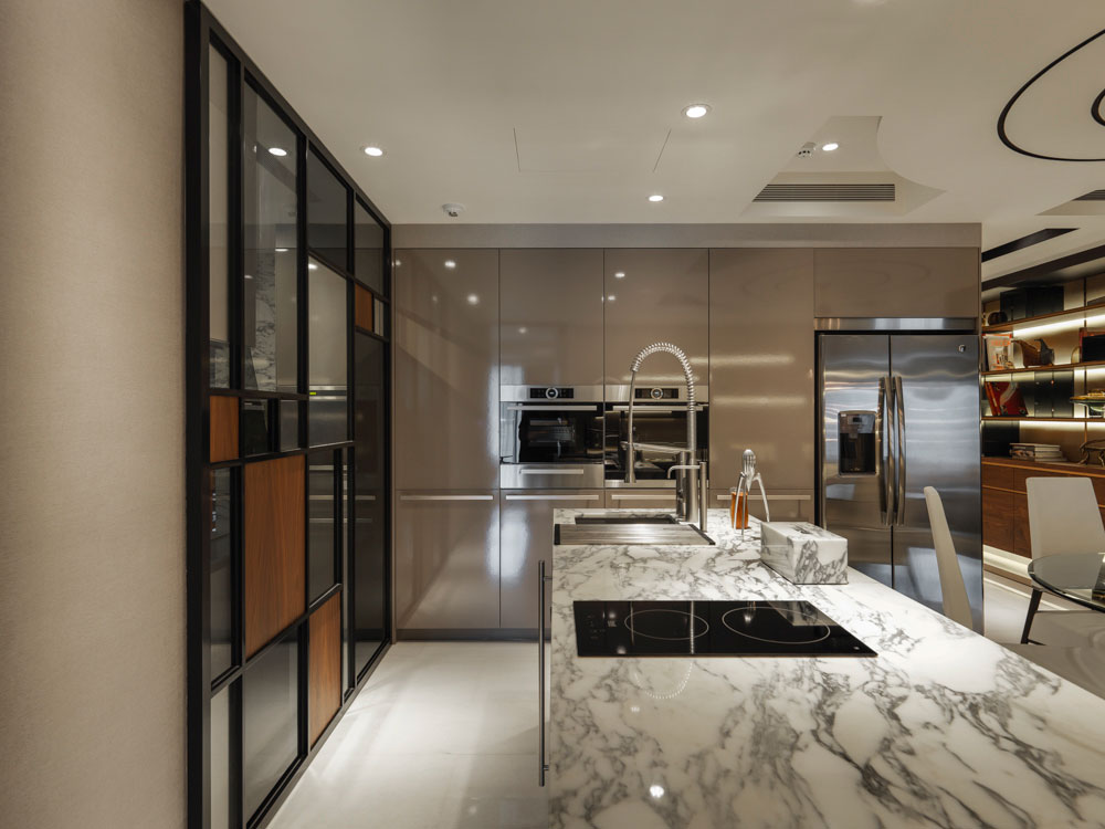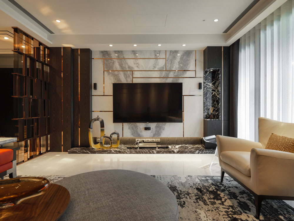 精緻的不規則分割金屬線條,巧妙豐富了壁面的層次感。雅潔明亮的客廳區,純淨而力道遒勁的電視主牆,運用深色調性木皮的鮮明紋理襯托其後的輪廓,以大理石視聽矮台別開生面,為整體造型做出序幕。