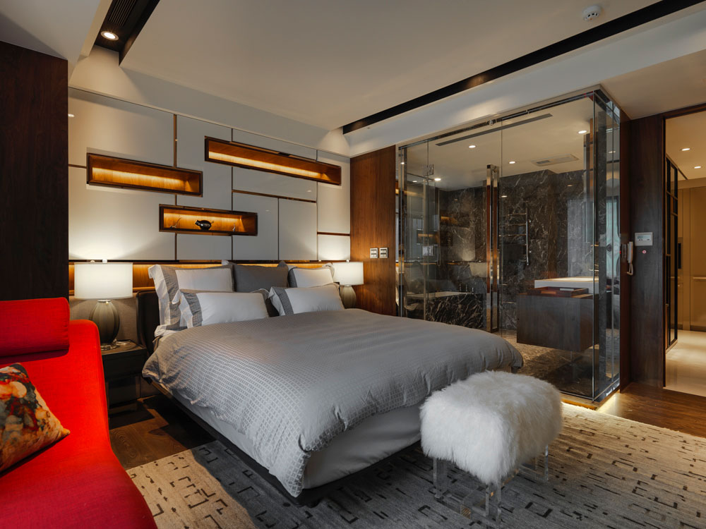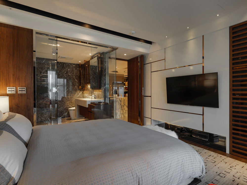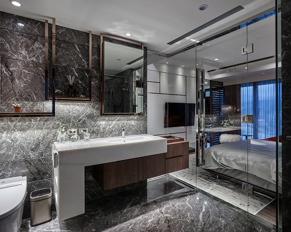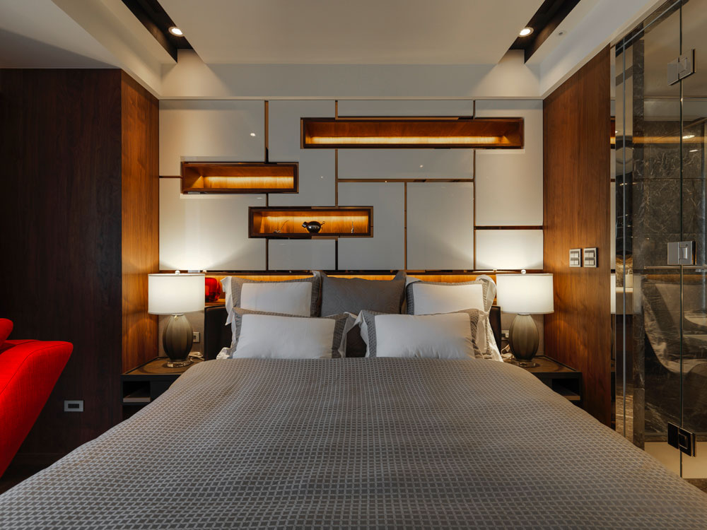 主臥床頭壁面的切割線條巧妙隱藏了壁櫃的收納空間,邊角的斜面突顯層次,再以深色調性木皮呈現空間的沉穩精緻。主衛浴利用懸吊性的置物平台及懸空的白色大理石洗手檯面,營造出輕盈懸浮的視覺感,在一派清淺簡約的基調中對應出優異質感。